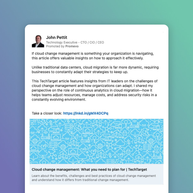 - Newsjacking to insert Promevo executives into timely, relevant industry conversations